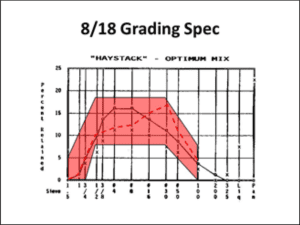 Re-discovery of the benefits of WGA led to a desire to create a specification for assuring that well-graded aggregate mixes were used in all projects. This led to the development of the 8-18 spec (no less than 8% and no more than 18% retained on each sieve), the Coarseness Factor Chart optimum zone (a trapezoidal zone on the Coarseness Factor Chart, developed in 1976 by my father) and the 0.45 power chart (often used for asphalt mix designs). However, concrete producers who had to meet these specifications often had to add a 3rd or 4th aggregate to make their current aggregates work, which was a major burden on the industry in the U.S.